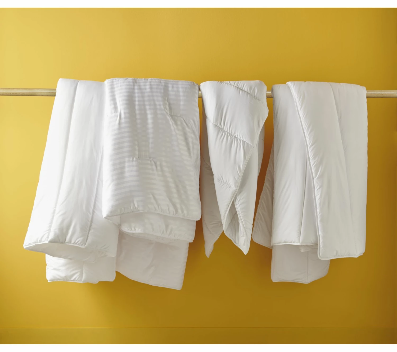 Cette couette tempérée blanche est entourée d’un biais qui renforce sa solidité. La fibre de garnissage est en polyester associée à du silicone. Le tout est revêtu d’une enveloppe de polyester dont 60 % en tissu TOPCOOL. Des surpiqûres longitudinales créent sur cette couette tempérée un motif simple et raffiné.