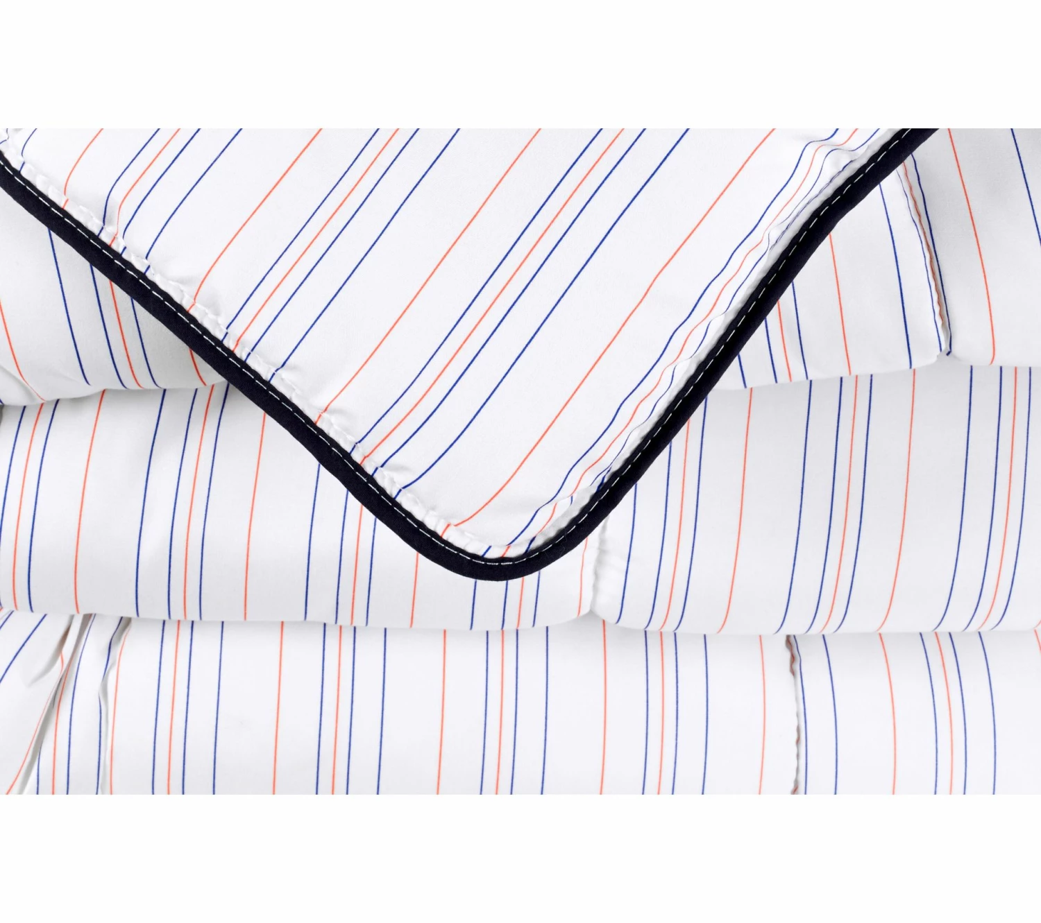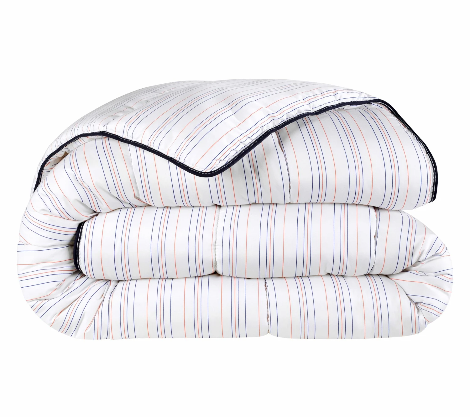 Cette couette multicoloredoit toute son originalité à son imprimé à rayures bleues, blanches et rouges, qui évoque les couleurs du drapeau français. Elle est terminée par un biais bleu marine qui apporte un supplément d’élégance. Vous pouvez l’utiliser telle quelle ou la couvrir avec une housse à motifs ou unie.