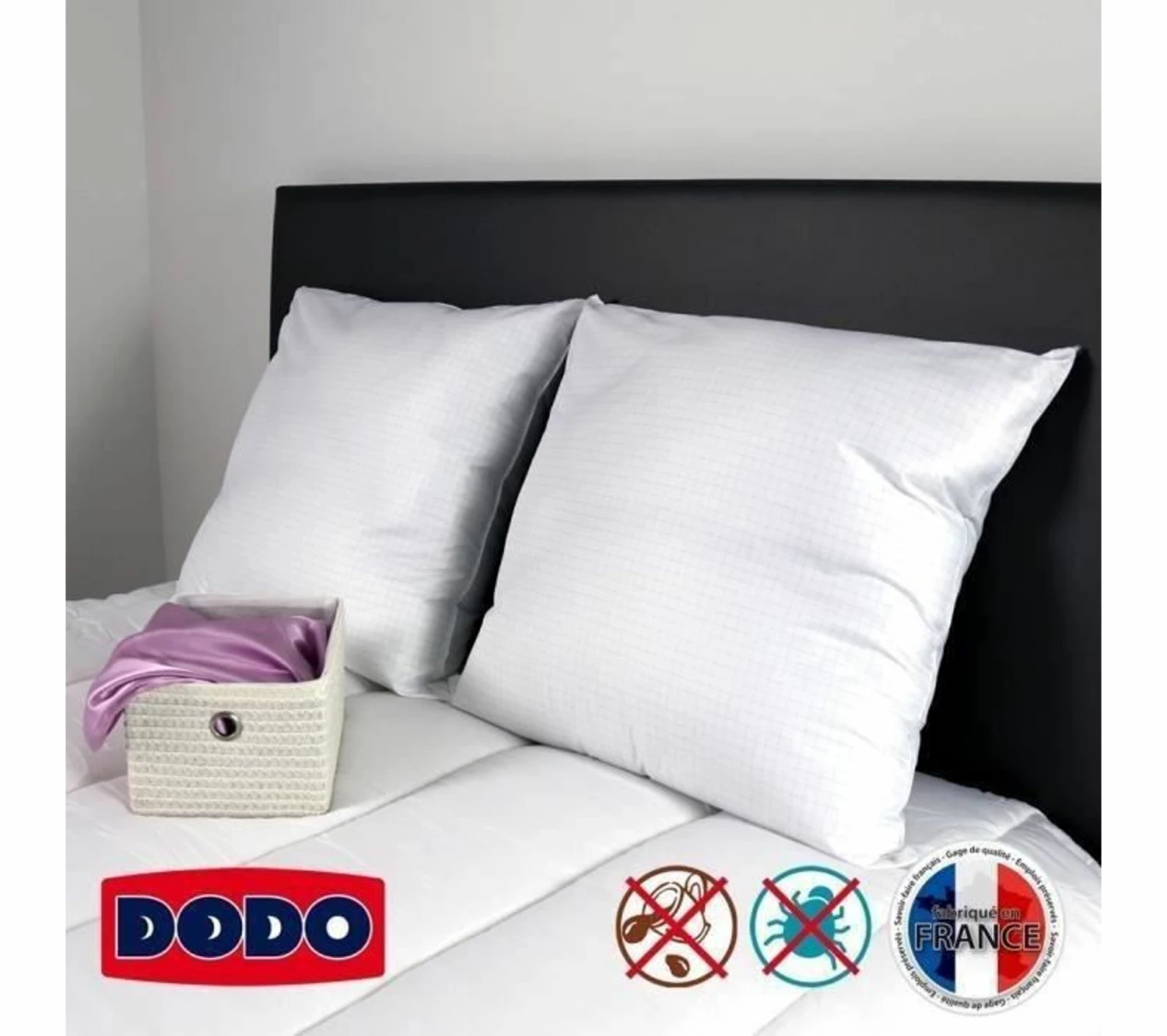Lot de 2 oreillers dodo total protect 65x65cm – enveloppe : 60% polyester top cool 39,40% polyester 0,60% fil de carbone – garnissage : 100% polyester fibre creuse siliconée – traitement anti-transpiration, effet relaxant, anti-tâches, anti-acariens – fabrication française