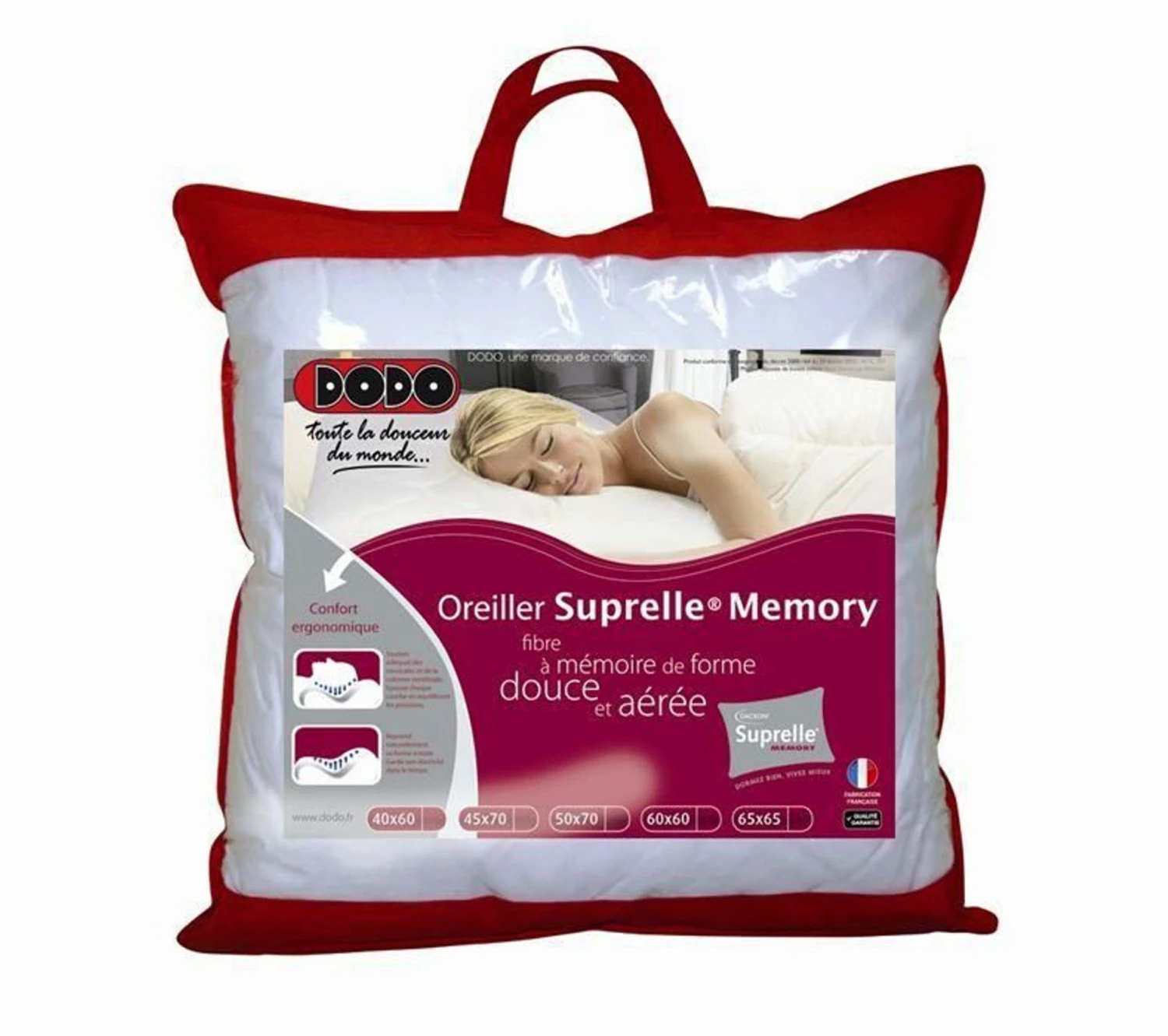 Dodo oreiller suprelle memory 65x65cm – enveloppe : 40% polyester 40% tencel 20% coton – garnissage : 100% polyester suprelle mémory fibres a mémoire de forme – motif : blanc
