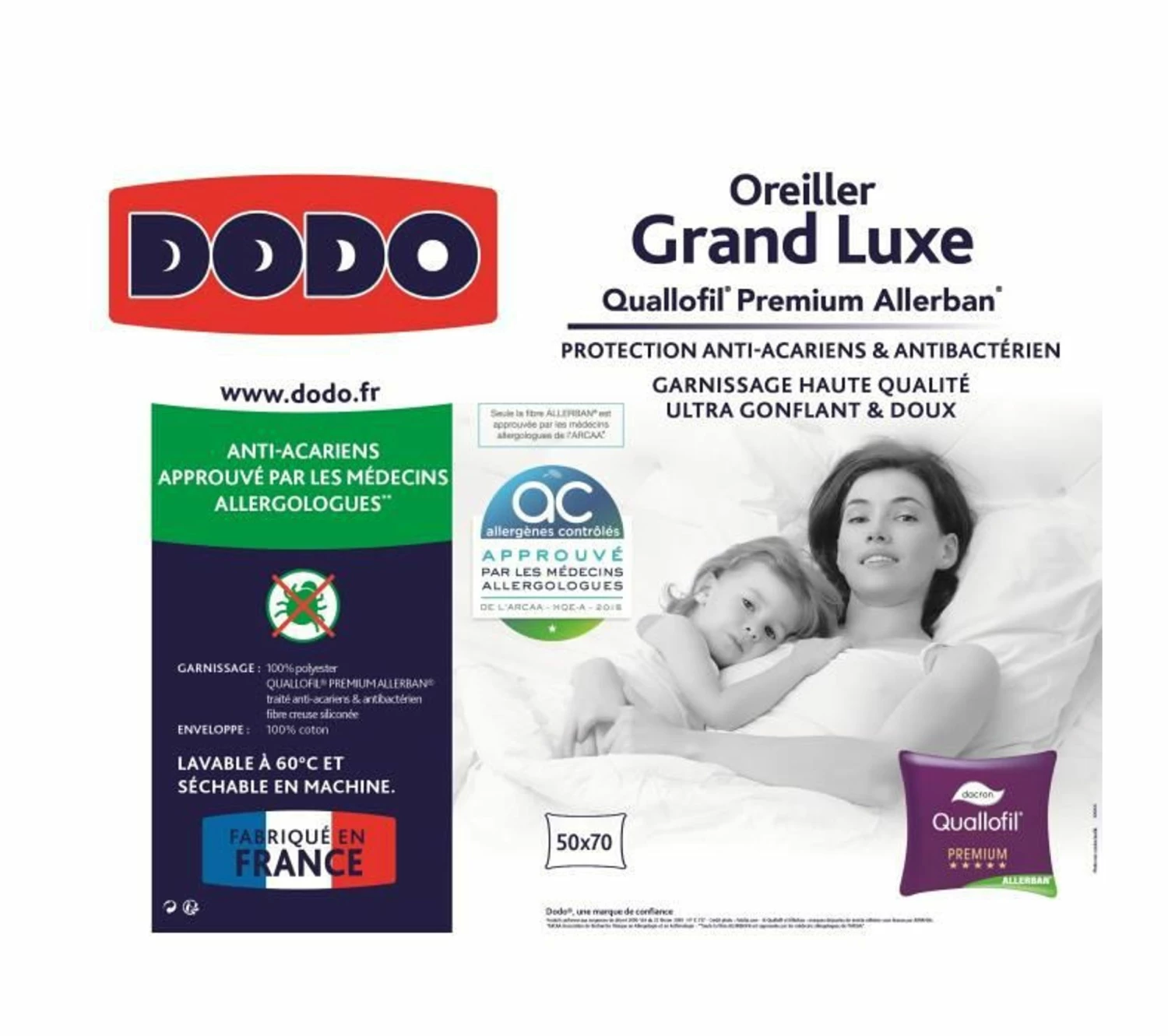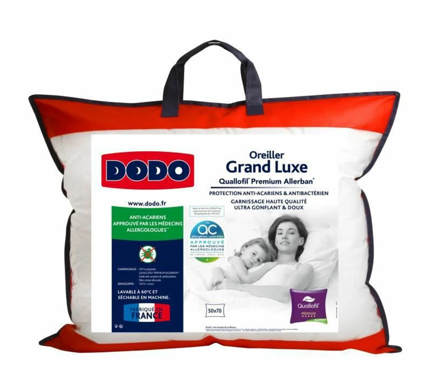 Dodo oreiller grand luxe quallofil allerban 50x70cm – oreiller grand luxe avec enveloppe 100% coton pour des nuits tout en douceur. Garnissage : fibres creuses 100% polyester siliconnée. Garnissage quallofil premium allerban de haute qualité ultra gonflant et doux. Traité anti-acariens et antimicrobien. Approuvé par les médecins allergologues de l’arcaa. Fabrication française. Dimensions : 50x70cm. Lavable a 60°c et séchable en machine