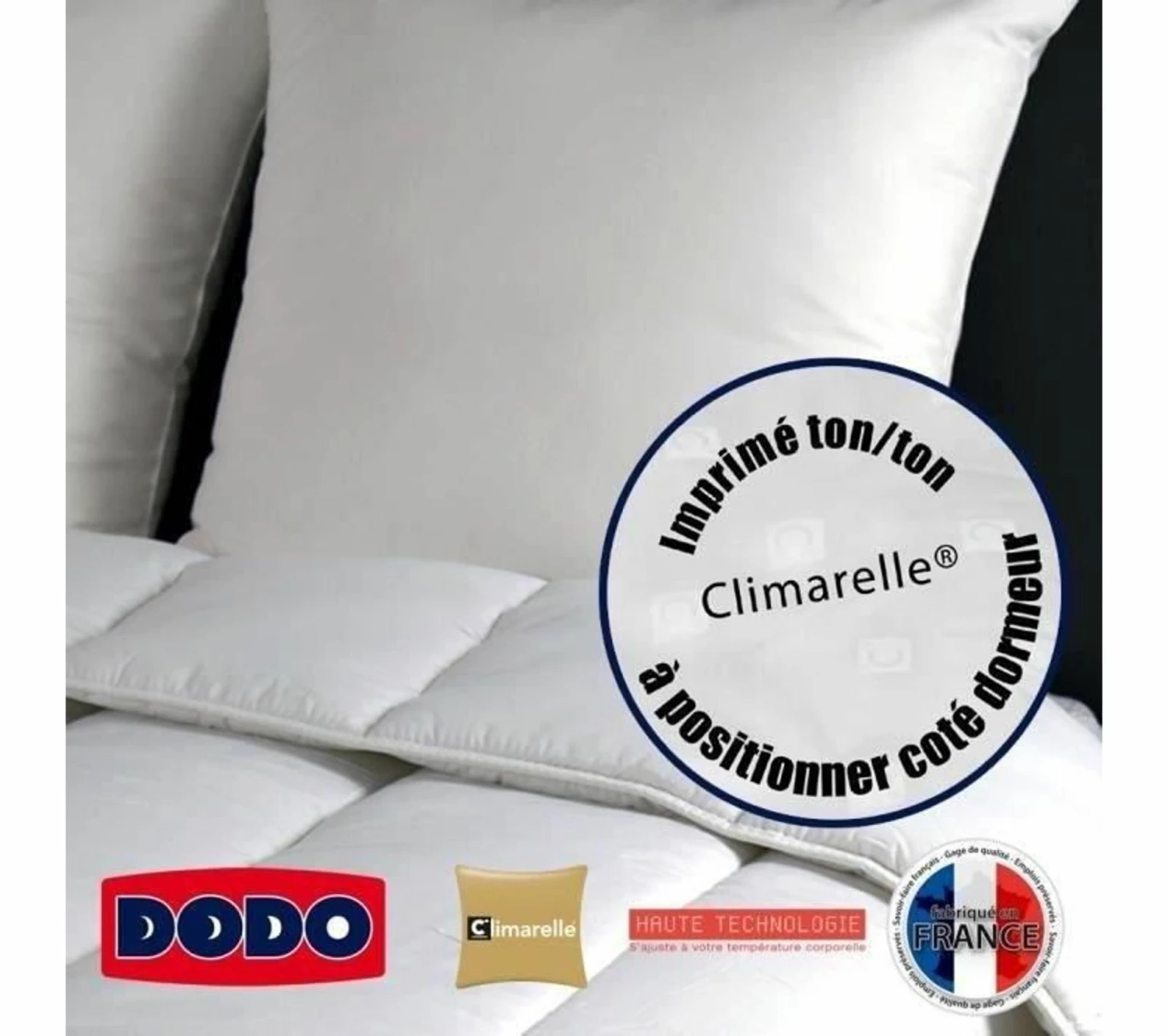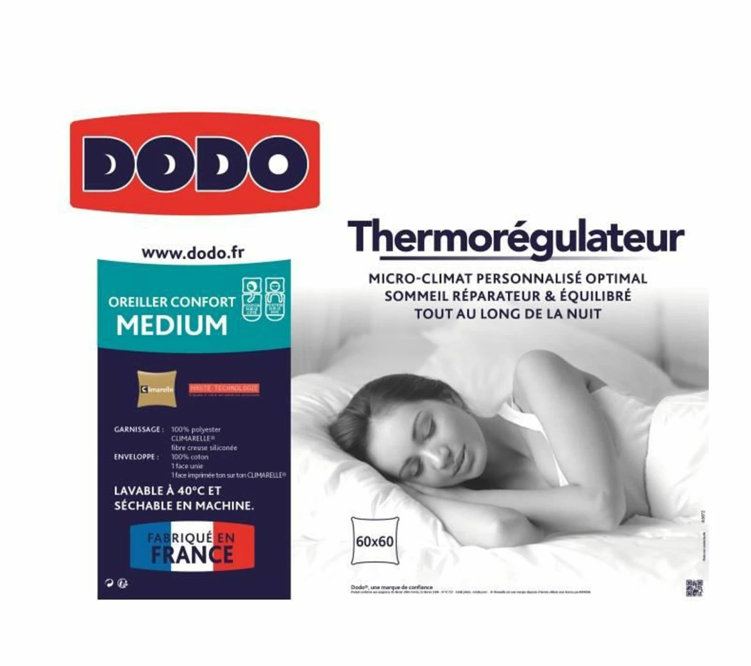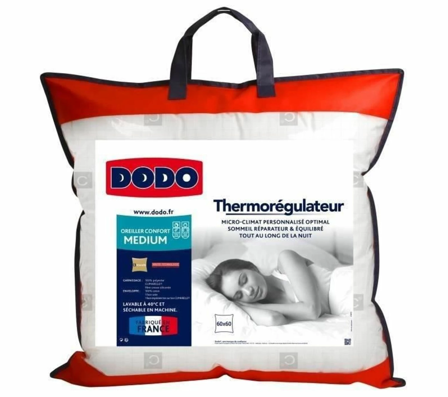 Oreiller thermorégulateur – 60 x 60 cm – blanc – garnissage 100% polyester climarelle fibre creuse siliconée – les microcapsules régulent la température pour procurer un micro-climat personnalisé optimal favorisant un sommeil réparateur et équilibré – enveloppe 100% coton – face imprimée ton sur ton.