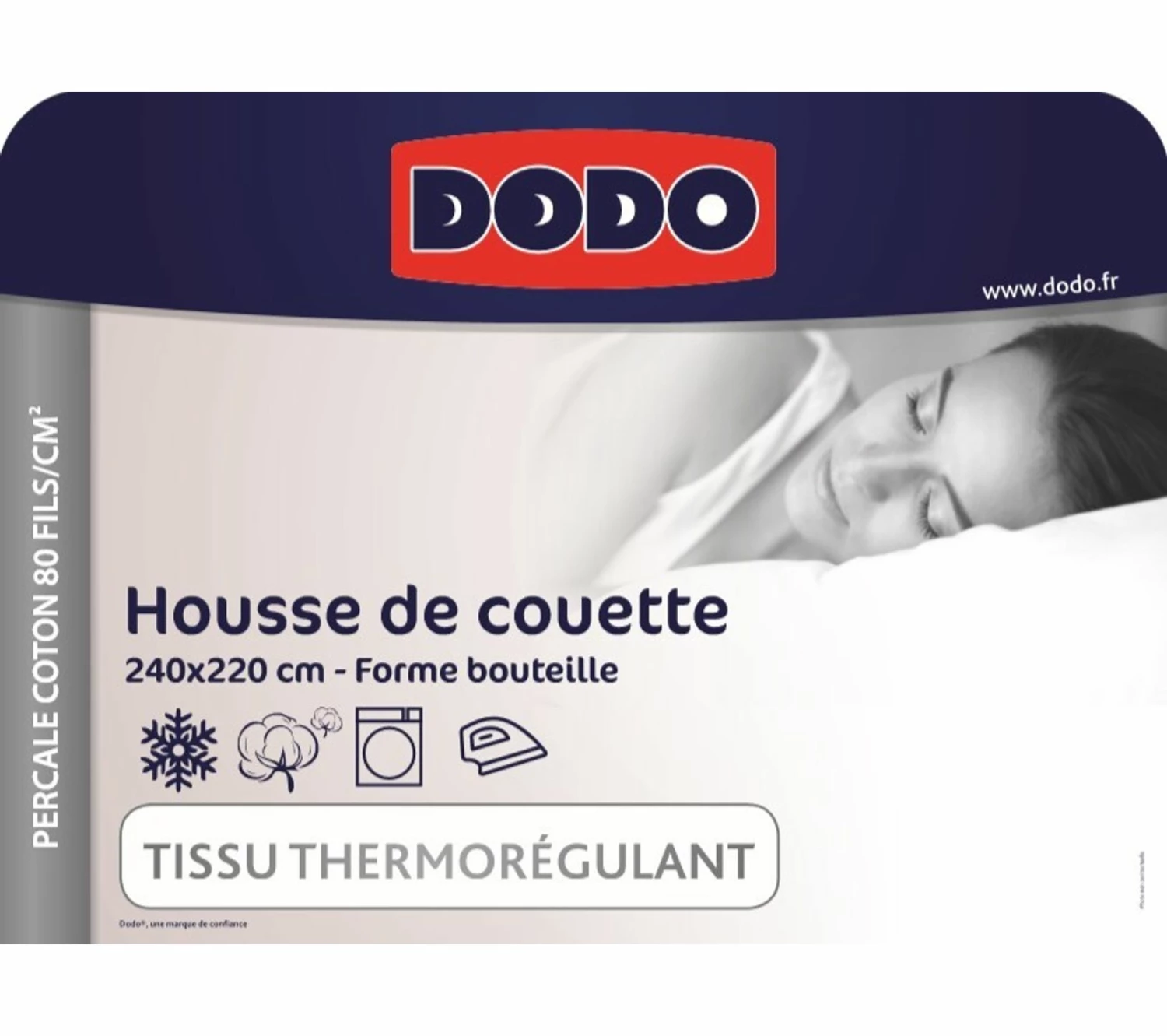 Offrez-vous des nuits fraîches et ultra douillettes avec cette housse de couette en percale de coton à l’effet thermorégulant. Conçue pour les couchages doubles, cette housse de couette 240 x 220 cm convient aux lits deux personnes de taille standard ou queen size. Facile à mettre en place, cette housse de couette de la marque DODO reste bien stable grâce à sa forme bouteille. En effet, sa base resserrée empêche la couette de glisser. Simple à entretenir, elle se lave en machine, résiste au sèche-linge et se repasse sans difficulté.
