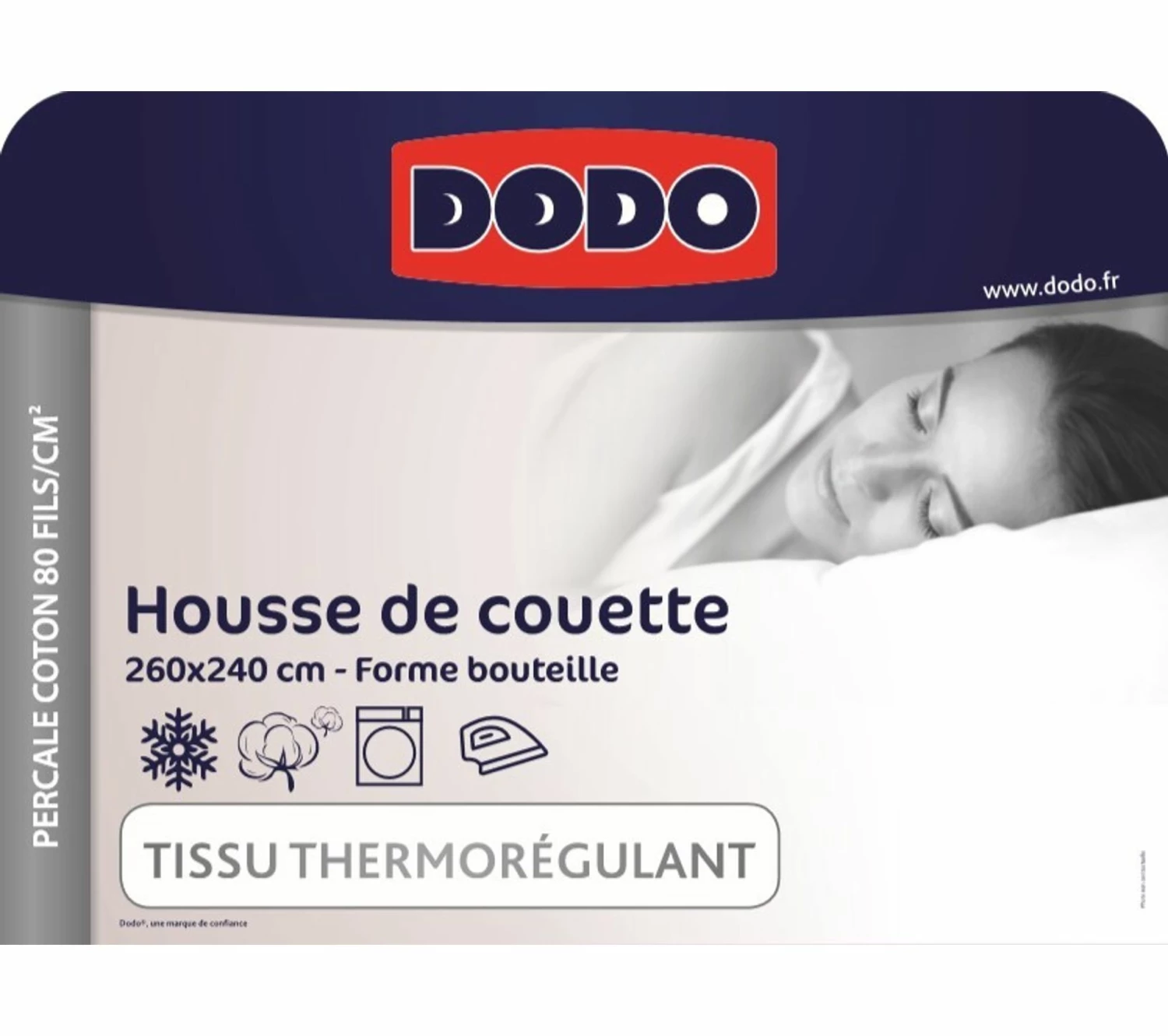 Cette housse de couette DODO se compose de percale de coton, une matière de qualité supérieure. Très fine, elle n’en est pas moins confortable. Grâce aux propriétés thermorégulatrices de son tissu, elle vous permet de ne pas souffrir de la chaleur. Cette housse de couette 260x 240 cm protège vos larges couettes pour deux personnes. Douce, elle est également pratique. Elle passe en effet en machine. Dès que vous souhaitez la nettoyer, il vous suffit de mettre cette housse de couette dans votre lave-linge et de sélectionner le programme adapté. Résistante, elle peut aussi être repassée pour la débarrasser des plis disgracieux.