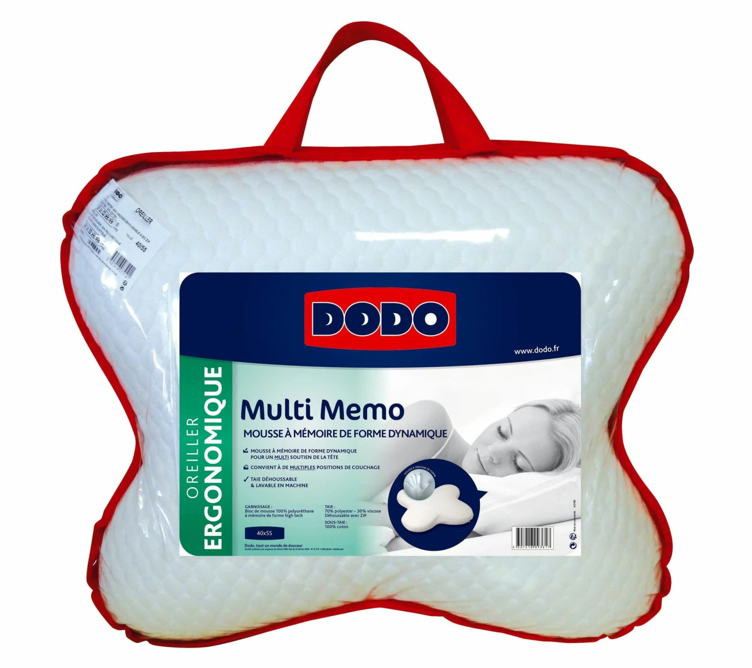 L’oreiller ergonomique DODO MULTI MEMO offre la possibilité de passer des nuits relaxantes en s’adaptant à la morphologie de son utilisateur. Il est composé d’un bloc de mousse à mémoire de forme qui se souvient de la position préférée du dormeur et s’adapte à sa colonne vertébrale. Il épouse les différentes formes de l’utilisateur pour lui garantir un confort optimal. Cet oreiller ergonomique de 40 x 55 cm possède une taie intégrée. Munie d’un zip, elle est déhoussable et peut être lavée en machine. Une sous taie assure d’avoir une hygiène de haut niveau.