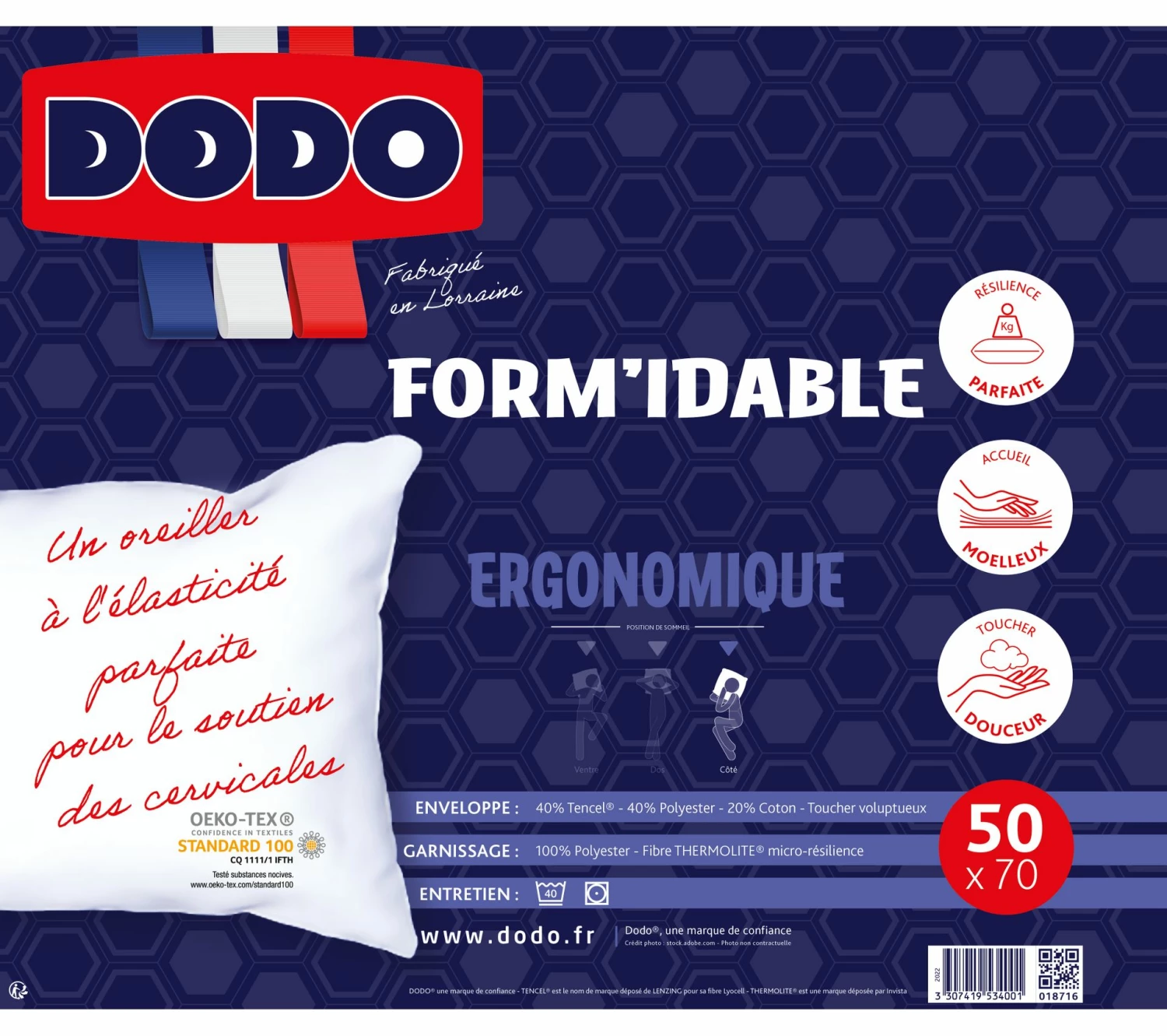 Retrouvez un sommeil de qualité avec cet oreiller ergonomique DODO FORM’IDABLE. Idéal pour les nuques sensibles et les personnes sujettes aux torticolis, il possède un généreux garnissage synthétique, 100 % polyester suprelle ultra résilience microfibres siliconées. Cette composition assure à cet oreiller ergonomique une élasticité et une fermeté optimales, qui épousent la morphologie du dormeur et maintiennent parfaitement les cervicales. De forme rectangulaire, cet oreiller ergonomique de 50 x 70 cm est également idéal pour dormir sur le côté. D’une grande douceur, son enveloppe est composée de tencel, polyester et coton. Pour l’entretenir, suivez les consignes présentes sur son étiquette.